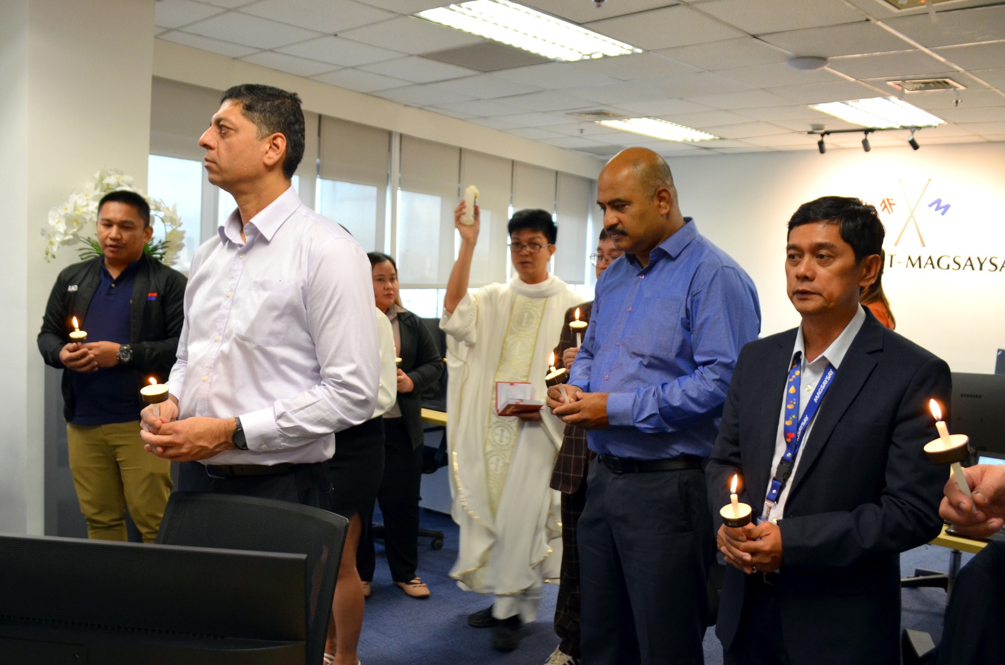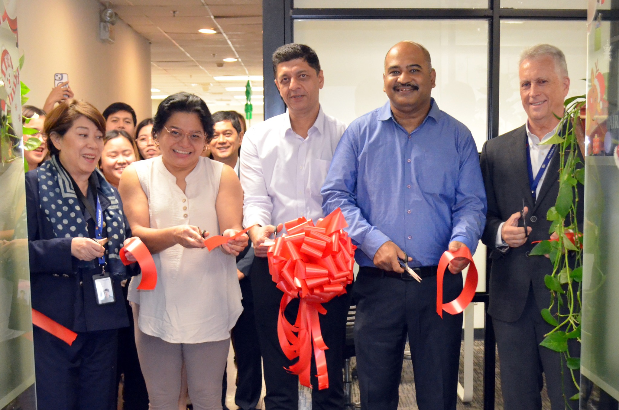 After her message, the Ribbon Cutting Ceremony was held led by Doris Magsaysay Ho, Michele Francisco, Ashish Kambo, Sonjay Bairagi and GPM President, Erik M. Nielsen. The ribbon-cutting signified the official opening of the new office and the beginning of a strengthened chapter of cooperation. The office premises and next door meeting room as well as the coins were blessed by Father Juan Piarist Nasataya who offered a prayer while the guests holding lit candles, followed by the traditional coin-throwing ceremony, symbolizing prosperity, good fortune, and the hope for continued success for everyone who will work and collaborate in the new office.